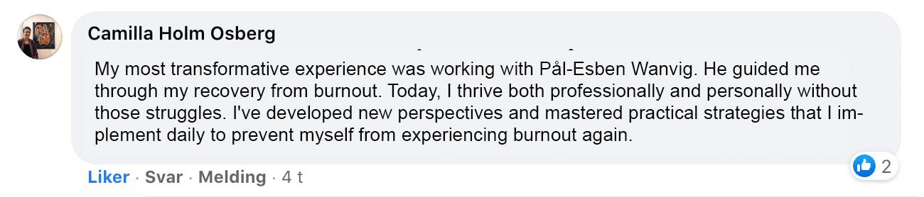 Jeg møtte Pål-Esben Wanvig første gang i 2014. Jeg var da i en situasjon av utbrenthet og oppgitthet. Jeg hadde en vanskelig jobbhverdag og lite overskudd. Jeg var så heldig å komme inn i veiledning med Pål-Esben. Dette førte til en totalforandring i livet der jeg i løpet av noen måneder var tilbake i 100% stilling med ny motivasjon og inspirasjon og et nytt tankesett. Dette var for meg et mirakel. Jeg har siden da deltatt på flere utdannelser og kurs og det gir meg så utrolig mye. Pål-Esben er det mest autentiske, rause, kunnskapsrike, empatiske og hjelpsomme menneske jeg kjenner. En person med et utrolig stort hjerte som har gitt meg så mye inspirasjon, motivasjon og ikke minst hjelp gjennom disse årene. Det har vært av uvurderlig betydning både for meg og mine nærmeste. Jeg har også sett hvordan andre har fått endret livet sitt på en fantastisk måte i løpet av denne tiden gjennom Pål-Esben sine kurs og utdanninger, som anbefales på det varmeste. I dyp takknemlighet, tusen takk for all kunnskap,hjelp, motivasjon og inspirasjon. Odd Arild Holmaas Intensivsykepleier.